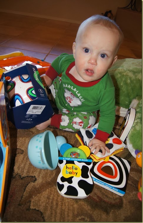 At 8:30 Greyson decided to wake up and join us. Poor baby is sick with another runny nose, but he was still a good sport. I think he enjoyed his 1st Christmas!